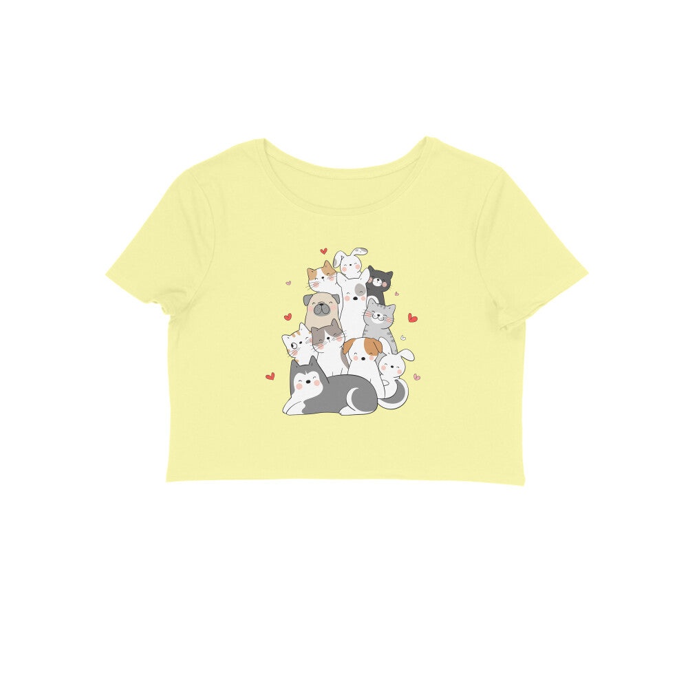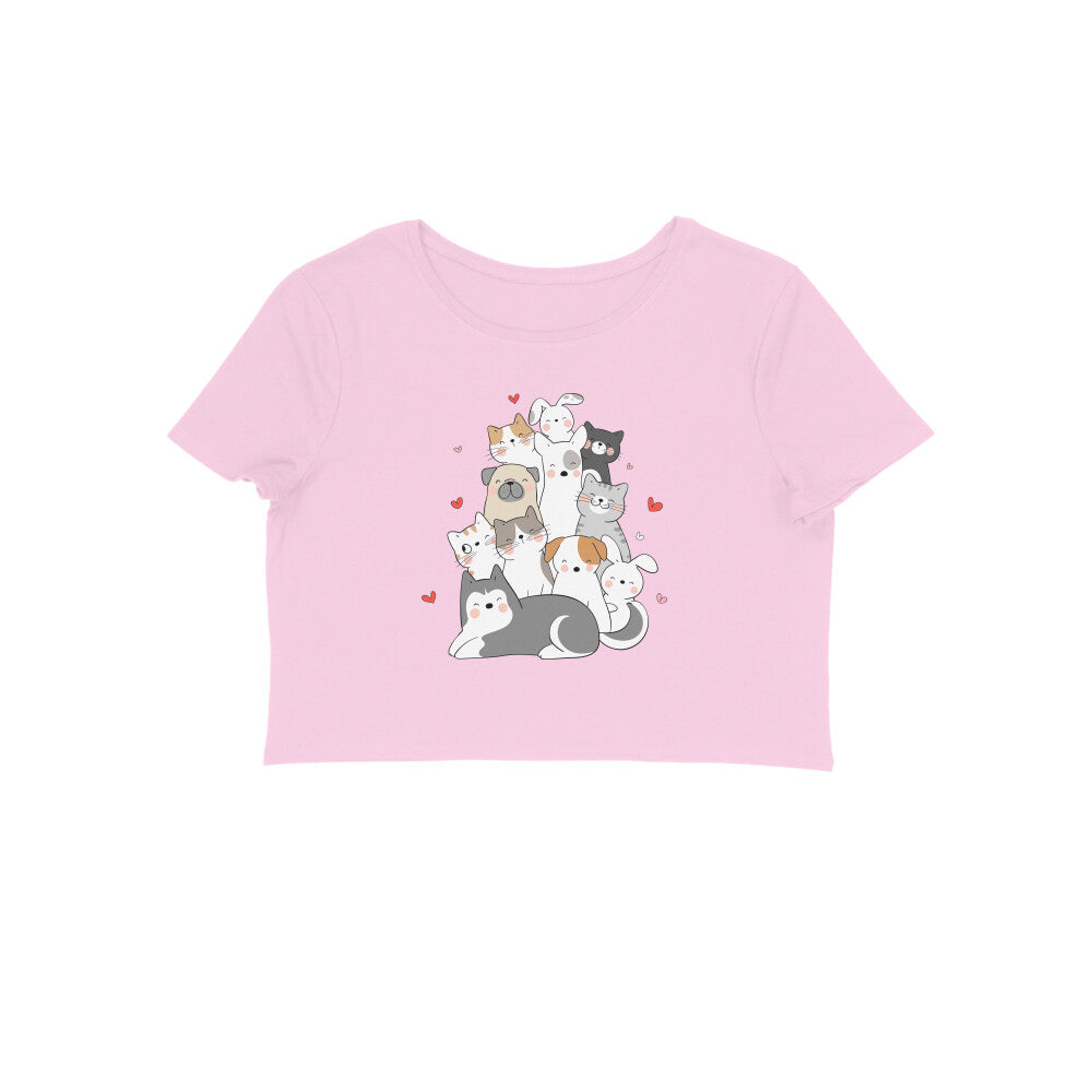 This 'Cuddle Crew' crop top brings together playful pups, cuddly kittens, and happy bunnies—all snuggled up with hearts full of friendship and paws full of mischief!