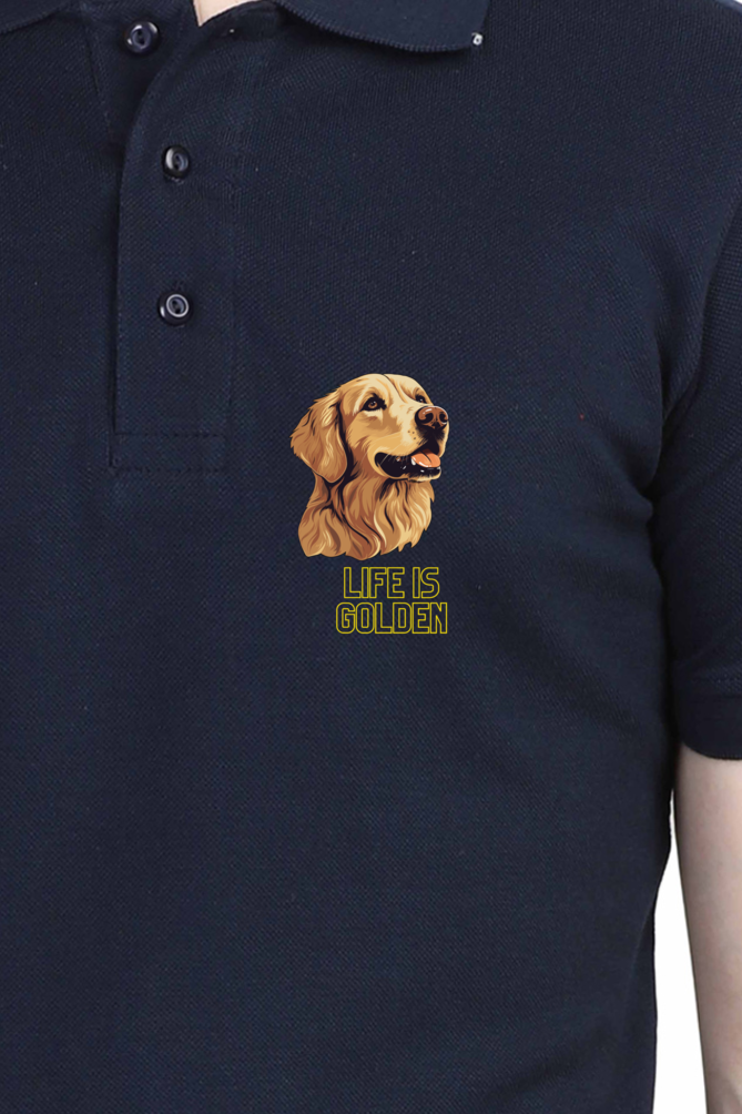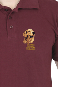A 'Retriever Royale' polo neck t-shirt that evokes the warmth and nostalgia of childhood, with the adorable golden retriever bringing memories of playtime, comfort, and joy.