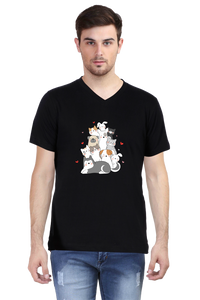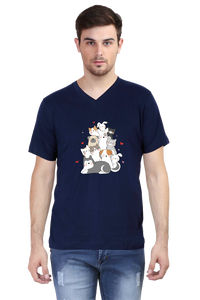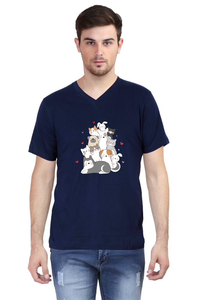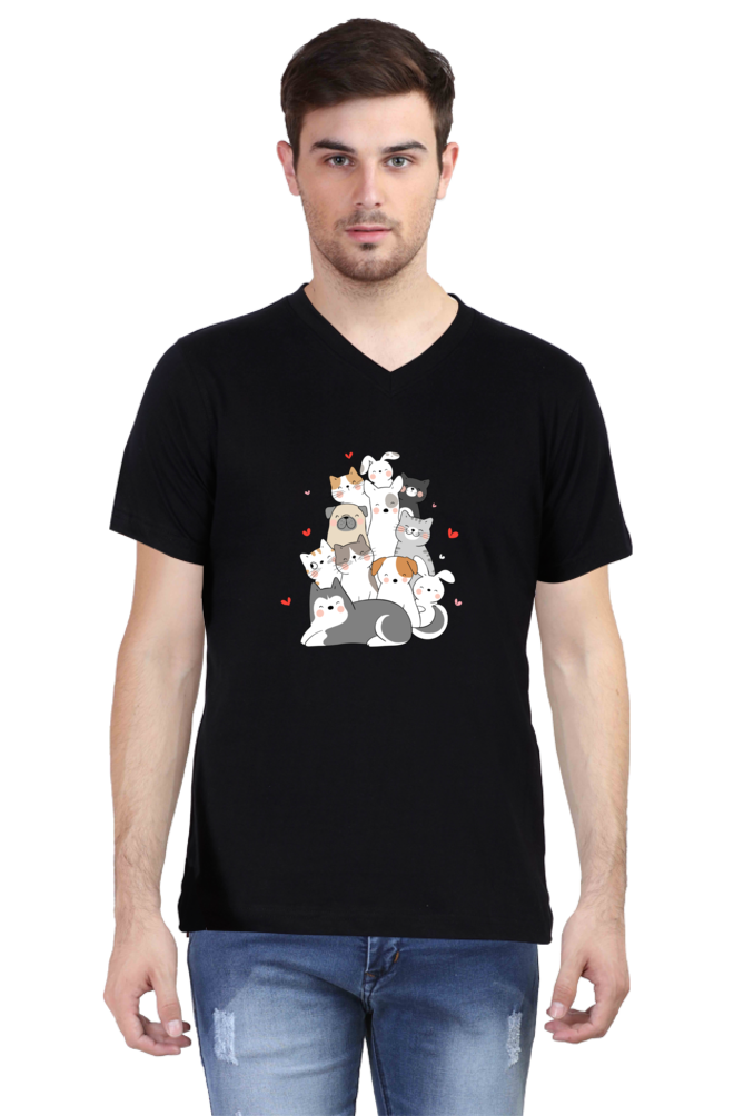 This 'Cuddle Crew' men's v-neck t-shirt brings together playful pups, cuddly kittens, and happy bunnies—all snuggled up with hearts full of friendship and paws full of mischief!