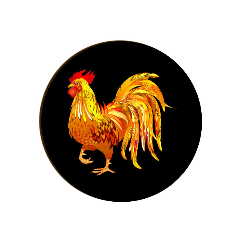 A 'Cock-a-Doodle-Doo' round coaster captures pride and grace, with its stunning colours and intricate feathers, showcasing regal presence and timeless appeal.