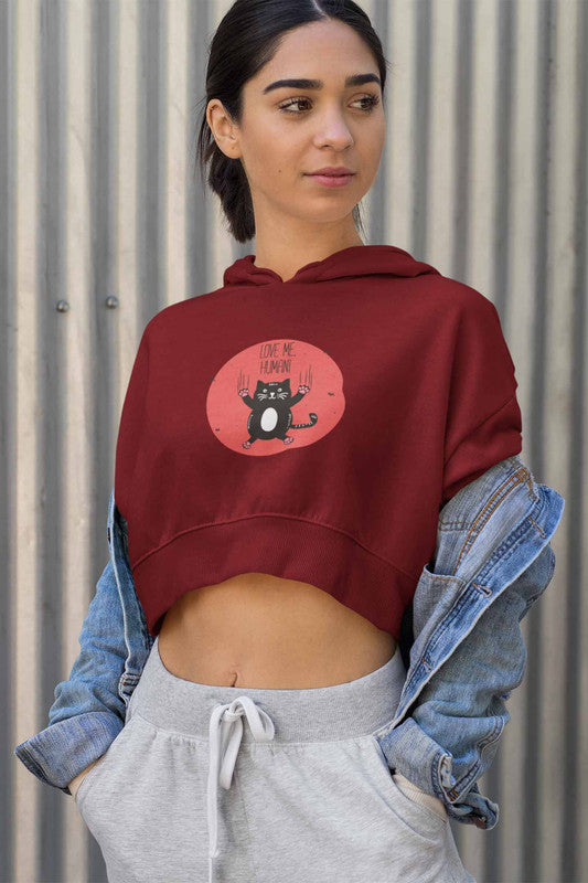 Who says cats aren't affectionate? If your cat is always in need of tender loving care, get 'Love Me, Human' women's crop hoodie and give them lots of attention!
