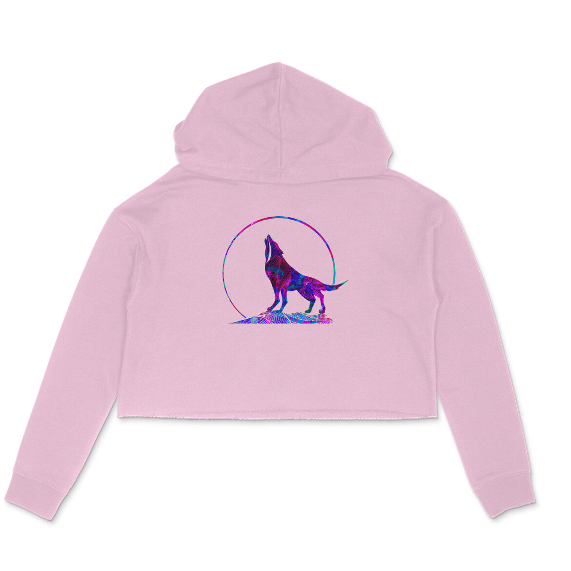 A mesmerising fusion of nature and neon! This electric wolf 'Spirit Wolf' crop hoodie sees glowing moon, untamed energy, and the spirit of the wild in cosmic colours.