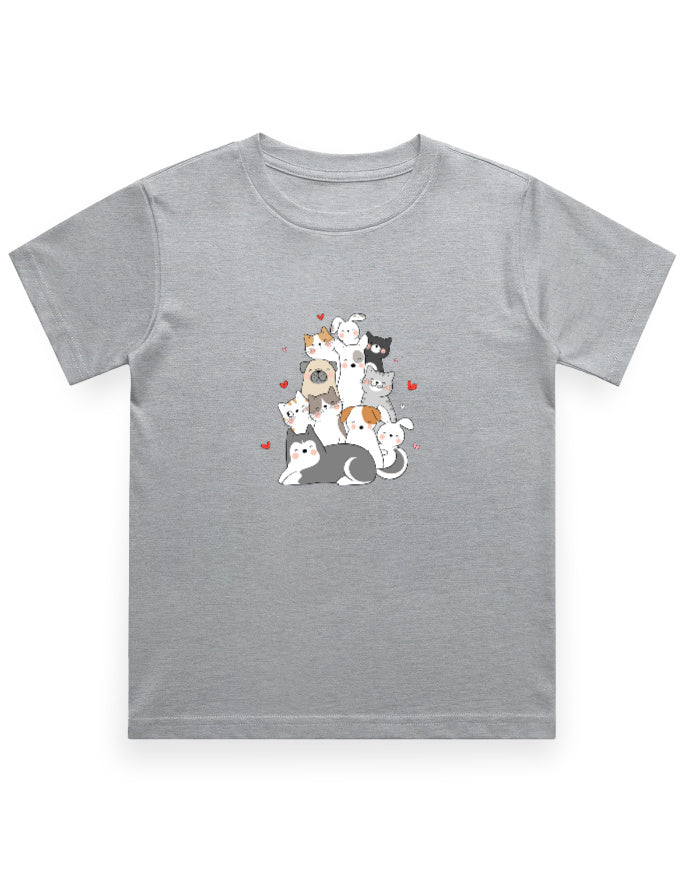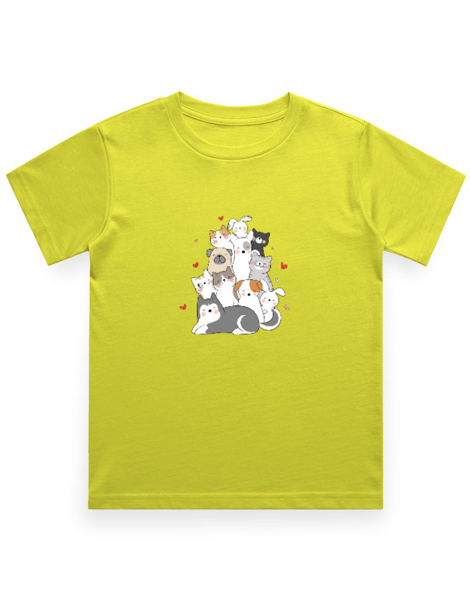 This 'Cuddle Crew' boy's t-shirt brings together playful pups, cuddly kittens, and happy bunnies—all snuggled up with hearts full of friendship and paws full of mischief!