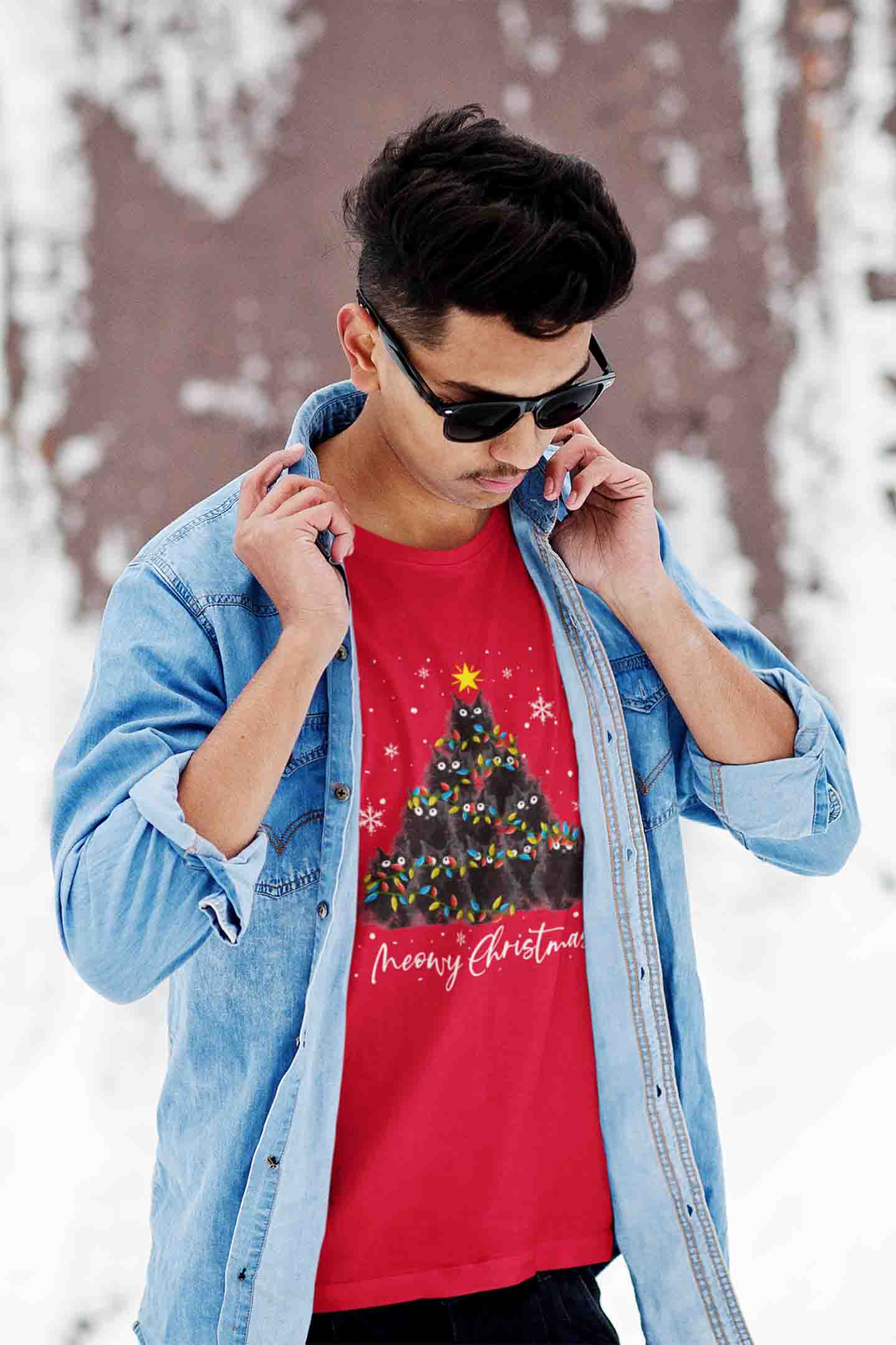 This 'Meowy Christmas' men's t-shirt shares the feline joy of the holiday season, whiskers a-twinkle, and a purr-fect blend of coziness and festive cheer.