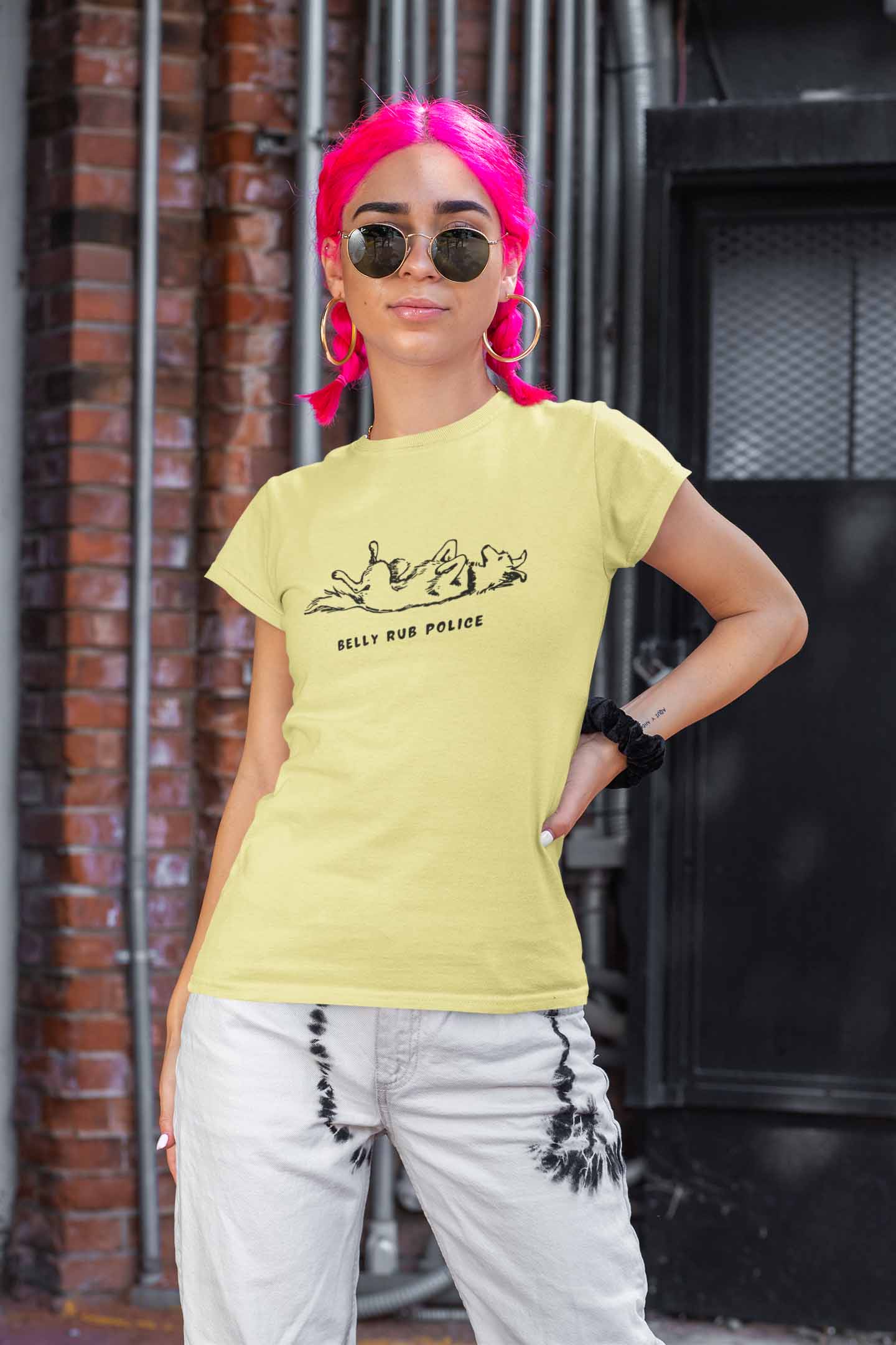 Attention, human! The Belly Rub Police are on patrol! This 'Belly Rub A Dub' women's round neck t-shirt enforces one rule—belly rubs are mandatory, and resistance is futile.