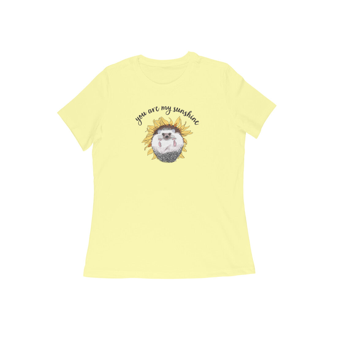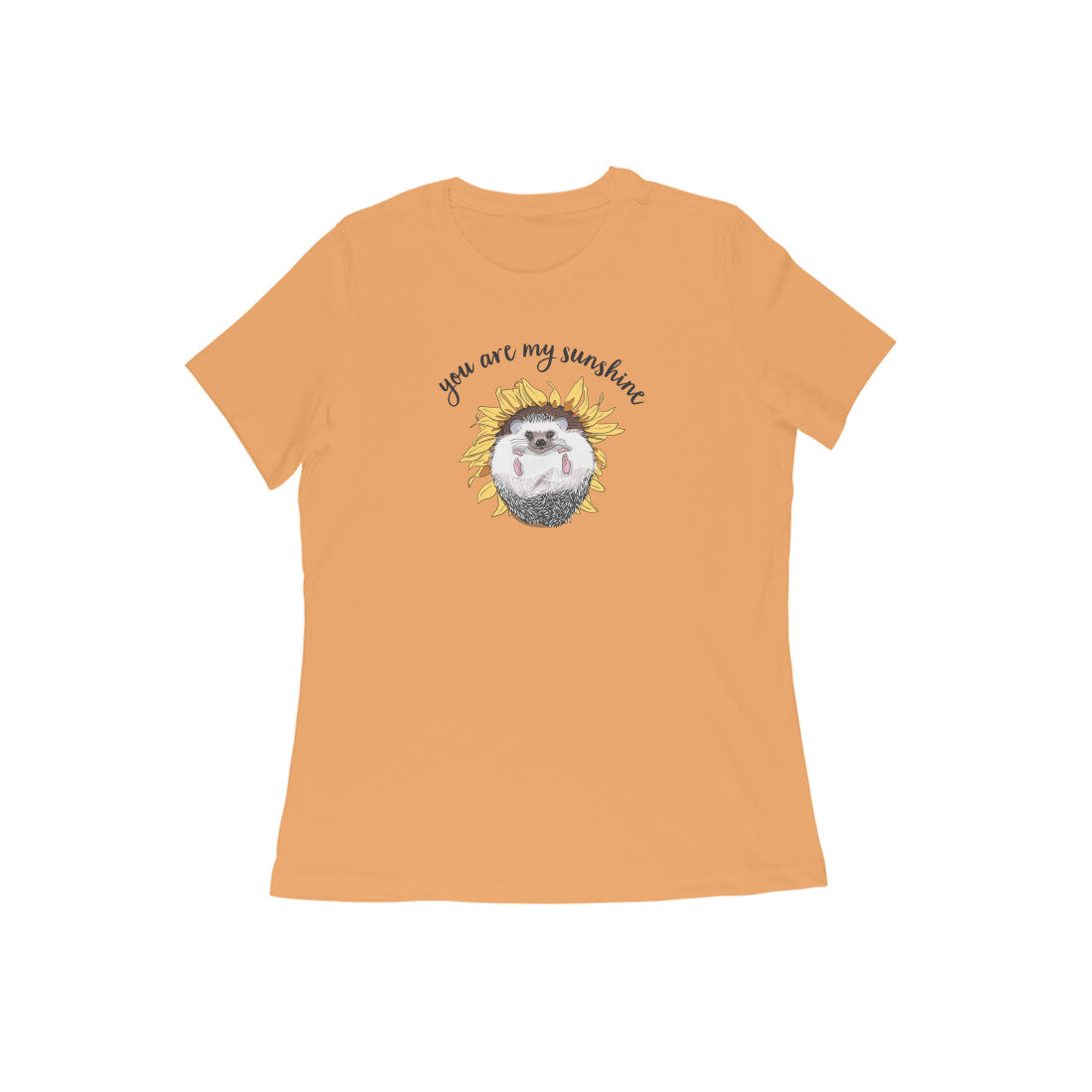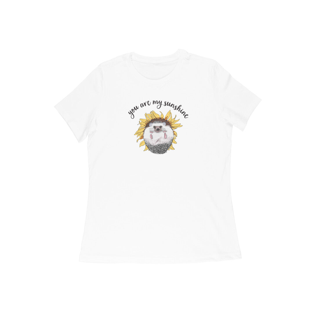 Who doesn't love the whimsical and carefree nature of sunny days? This cute hedgehog lounging in a sunflower 'Sunny Side Up' women's round neck t-shirt reminds you to keep that smile on your face.