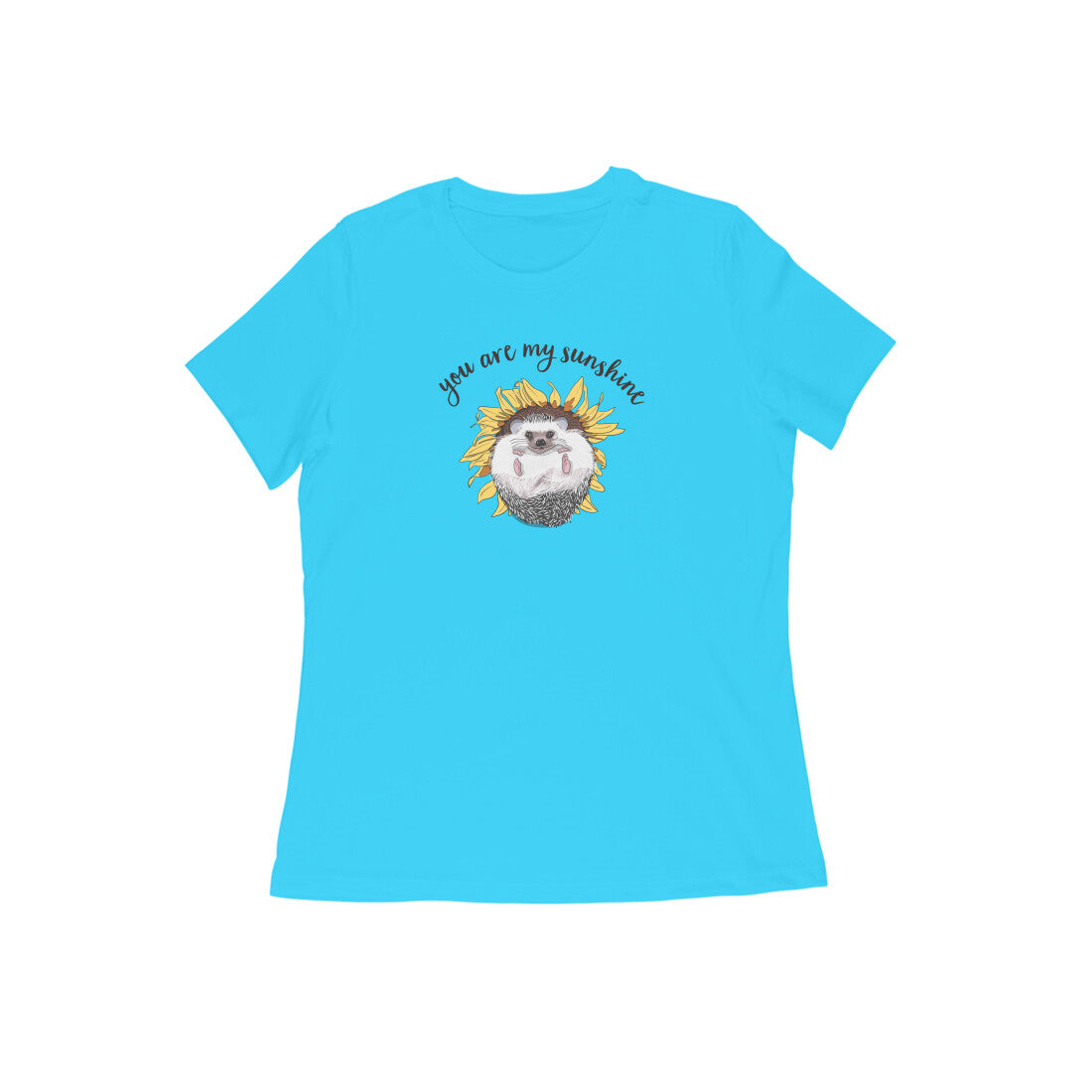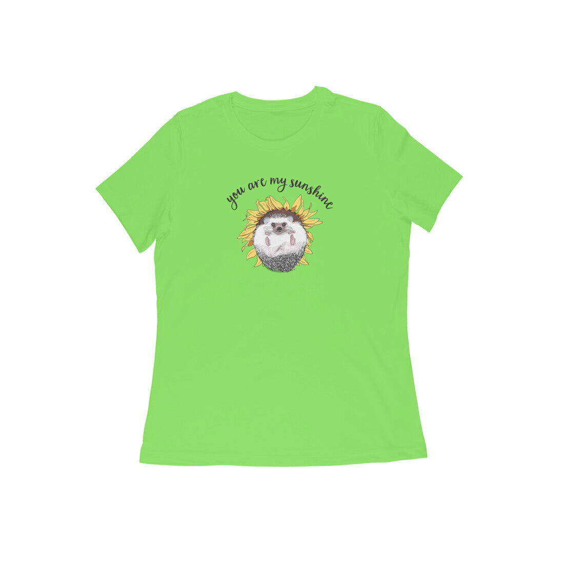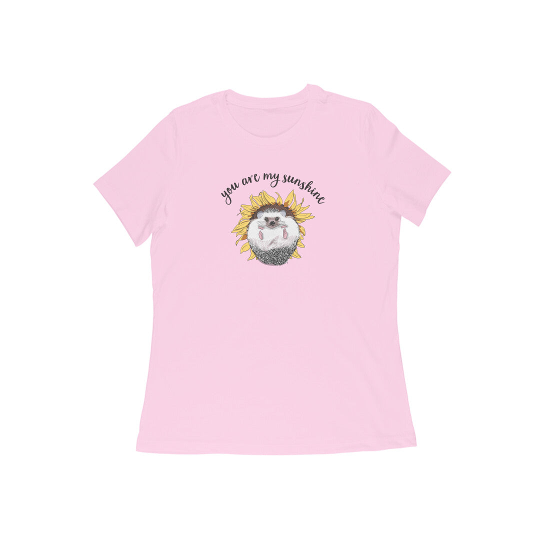 Who doesn't love the whimsical and carefree nature of sunny days? This cute hedgehog lounging in a sunflower 'Sunny Side Up' women's round neck t-shirt reminds you to keep that smile on your face.